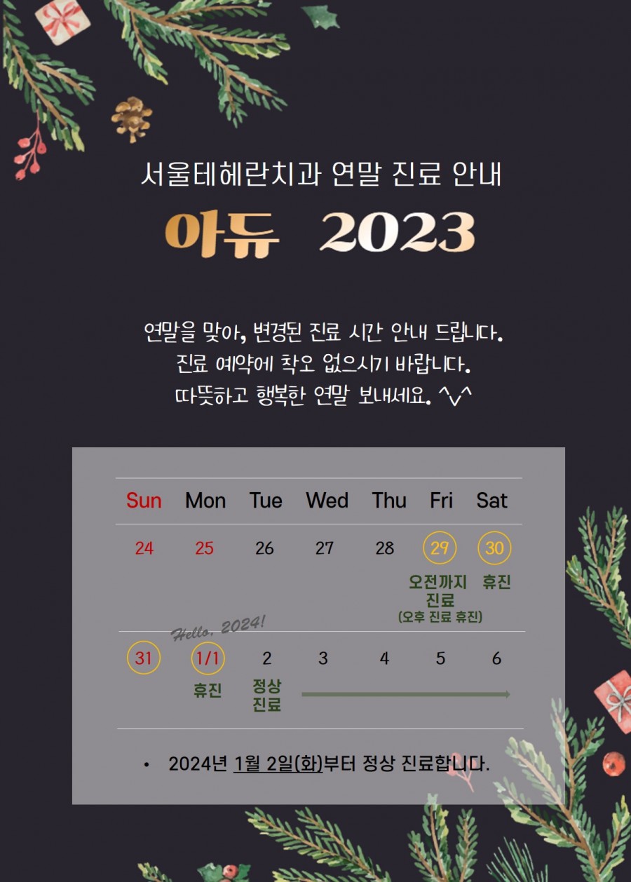 12월 30일,31일, 2024년 1월 1일 휴진입니다.